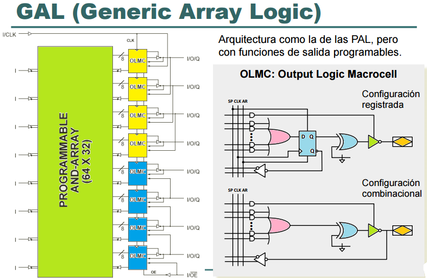 Básicamente, una GAL está formada por una matriz de puertas AND reprogramable conectada a una matriz de puertas OR fija. Al igual que la PAL, esta estructura permite implementar cualquier función lógica como suma de productos con un número de variables definido. </H3> |