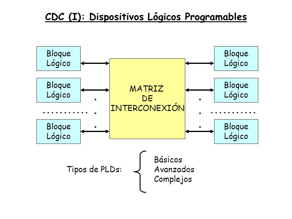 Un Dispositivo Lógico Programable (PLD) es cualquier dispositivo lógico cuya función está especificada por el usuario, después de fabricado el dispositivo. Se usan para reemplazar lógica SSI y MSI, ahorrando así en costo y tiempo en el diseño. Entre ellos, encontramos: </H3> |